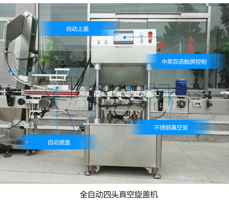 該生產線適合中小口徑三旋、四旋玻璃瓶調味醬的分裝,適合醬料、含顆粒黏稠物料的灌裝,物料接觸部分均采用316不銹鋼