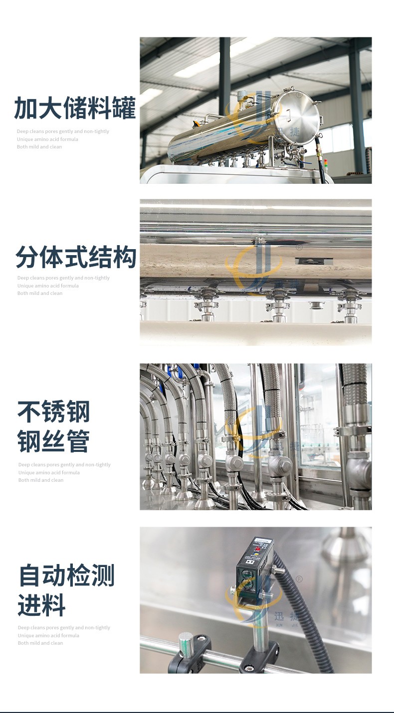 全自動液體灌裝機用于灌裝飲料、果汁,牛奶,酒精,消毒液,口服液,洗衣液等液體,廣泛應用于食品,化工,醫療等行業,灌裝精密,功能強,實用性高的灌裝機械。