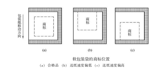 在包裝作業(yè)過(guò)程中,卷筒半徑逐漸減小,包裝紙所受張力發(fā)生變化,送紙輥與包裝紙之間的摩擦因數(shù)受環(huán)境溫濕度的影響而發(fā)生波動(dòng),加上商標(biāo)印刷誤差,以及送紙、縱封、橫封、切斷各部分速度的差異等因素,使得刀輥的實(shí)際切線(xiàn)偏離規(guī)定部位。即使這種位置誤差很小,例如在某—包裝袋上只偏差0.1mm,但包裝機(jī)速度很快,有的高達(dá)200包/min, 如不加以控制調(diào)節(jié),機(jī)器運(yùn)行1垃i六 后,誤差積累可達(dá)20mm,切線(xiàn)嚴(yán)重偏離規(guī)定部位,降低了包裝質(zhì)量,甚至造成廢品。如圖所示,圖(a)為合格品; 圖 (b) 為送紙速度偏低,商標(biāo)后移; 圖 (c) 為送紙速度偏高, 商標(biāo)前移。 為了保證包裝袋的正確封切, 必須在卷筒紙供送系統(tǒng)中, 引人商標(biāo)圖案自動(dòng)位置檢測(cè)與控制系統(tǒng)。目前應(yīng)用廣泛的是光電自動(dòng)定位系統(tǒng)。